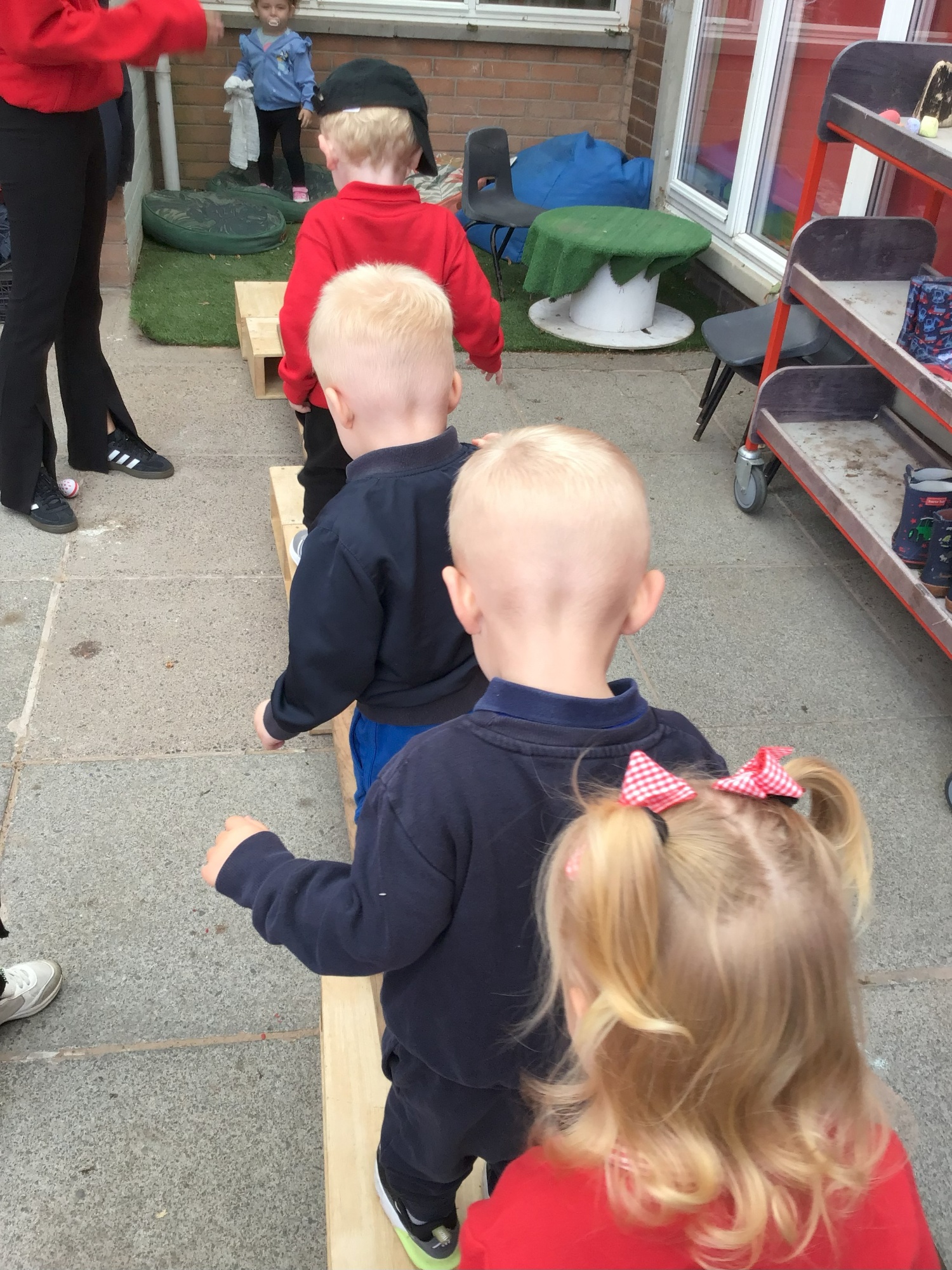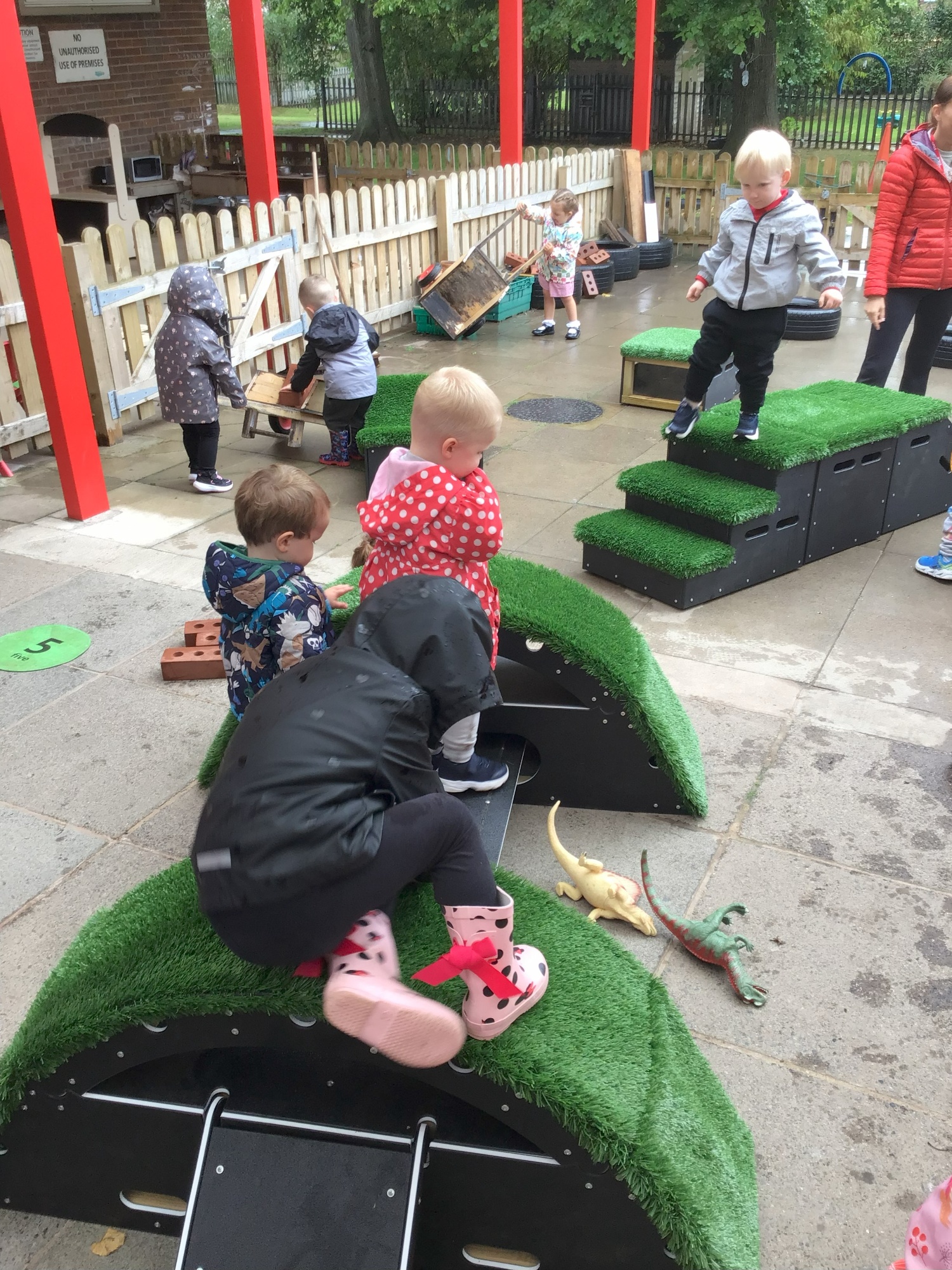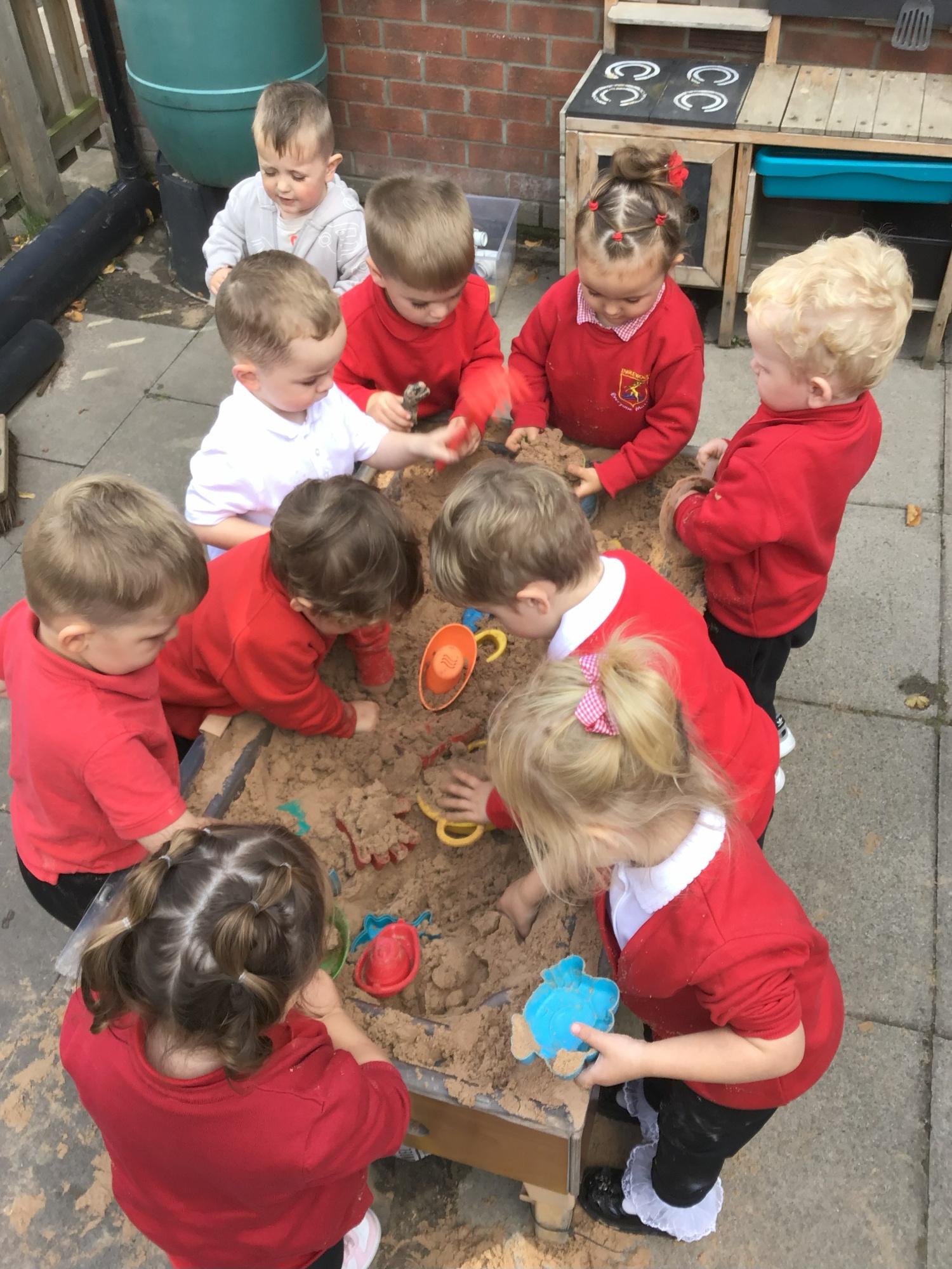 We have new gross motor climbing equipment which the children have been keen to have a go on. Developing climbing and balancing skills. We have been using big chalks to mark make and practise our pre writing shapes. We have been exploring sand and manipulating it with different tools. The children have been settling in and getting to know routines and forming relationships with the other children and staff. We have also had the opportunity to visit the school hall for some singing and dancing. We will start to talk about Autumn and notice changes in the environment.