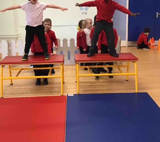 In gymnastics, we have enjoyed using the apparatus. We create different shapes on them – tuck, straight, star, pike and straddle.